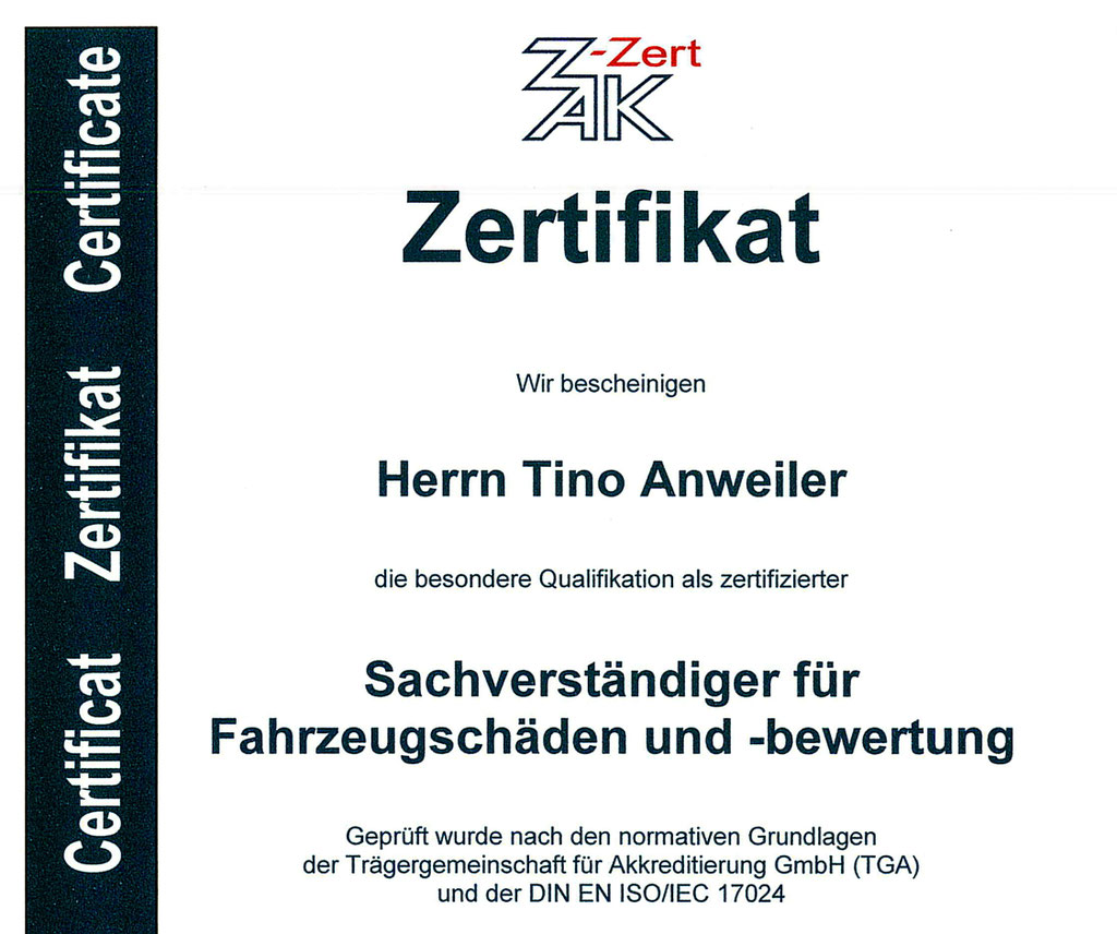 Personen zertifiziert für Fahrzeugschäden, Unfallschäden und Fahrzeugbewertungen, mit regelmäßiger Überwachung sowie Prüfung nach internationalen europäischer Norm DIN EN ISO/IEC 17024.