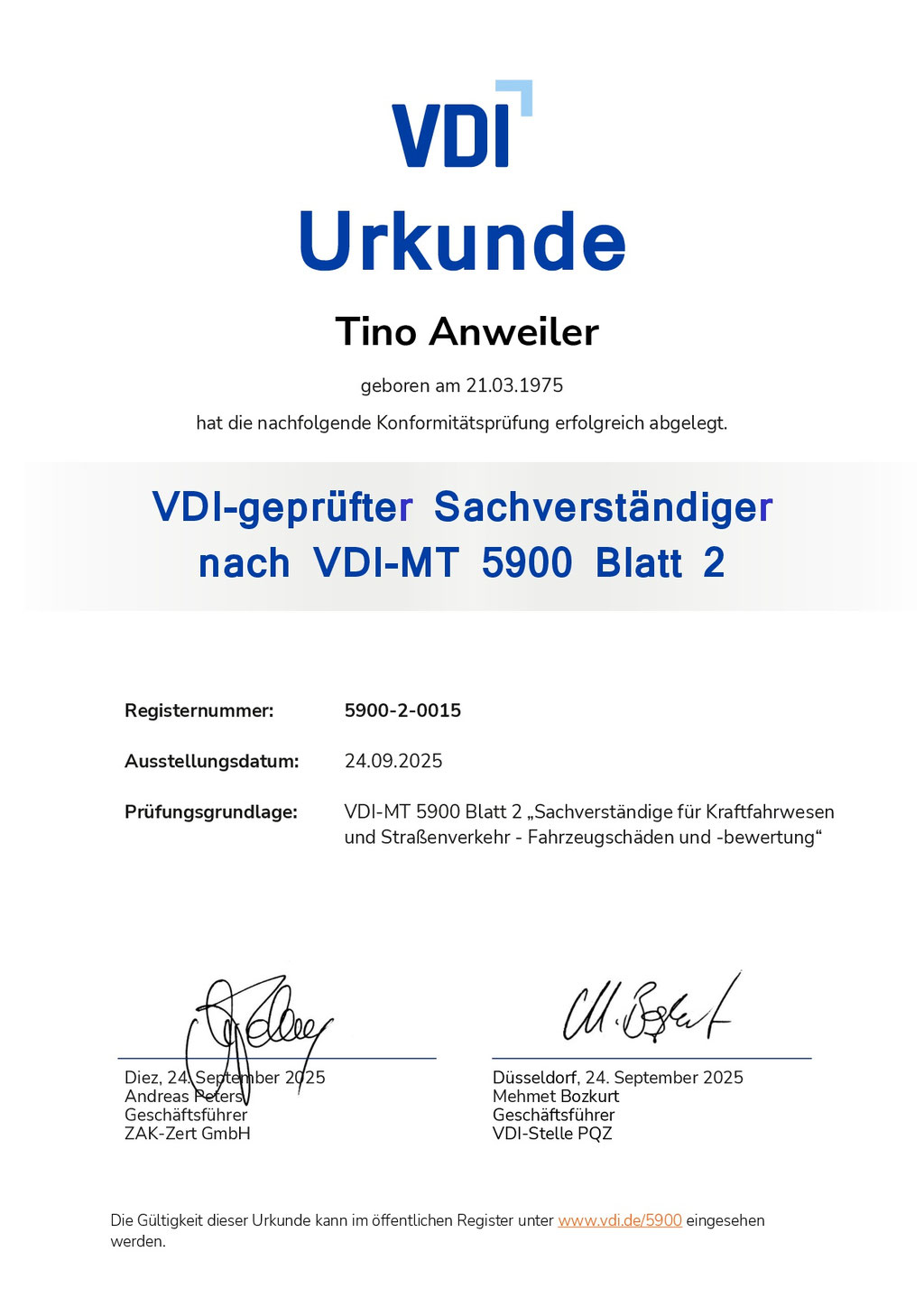 Ebenfalls wurde gerade die Konformitätsprüfung erfolgreich bei dem Verein Deutscher Ingenieure abgelegt. VDI-geprüfter Sachverständiger nach VDI-MT 5900 Blatt 2 "Sachverständiger für Kraftfahrwesen und Straßenverkehr - Fahrzeugschäden und -bewertungen"